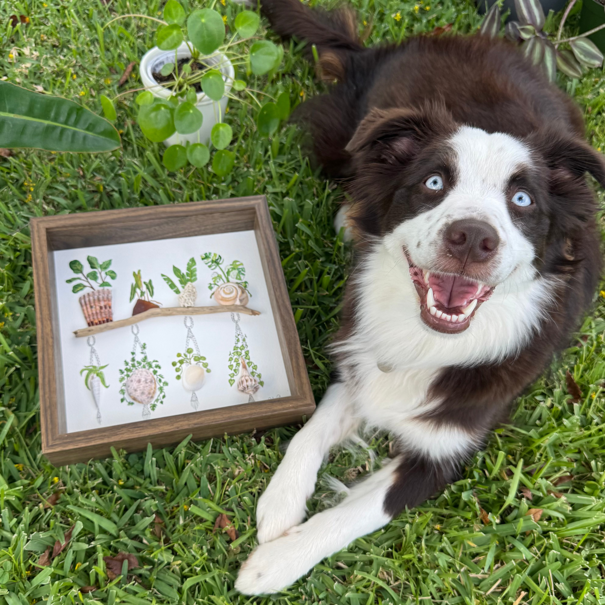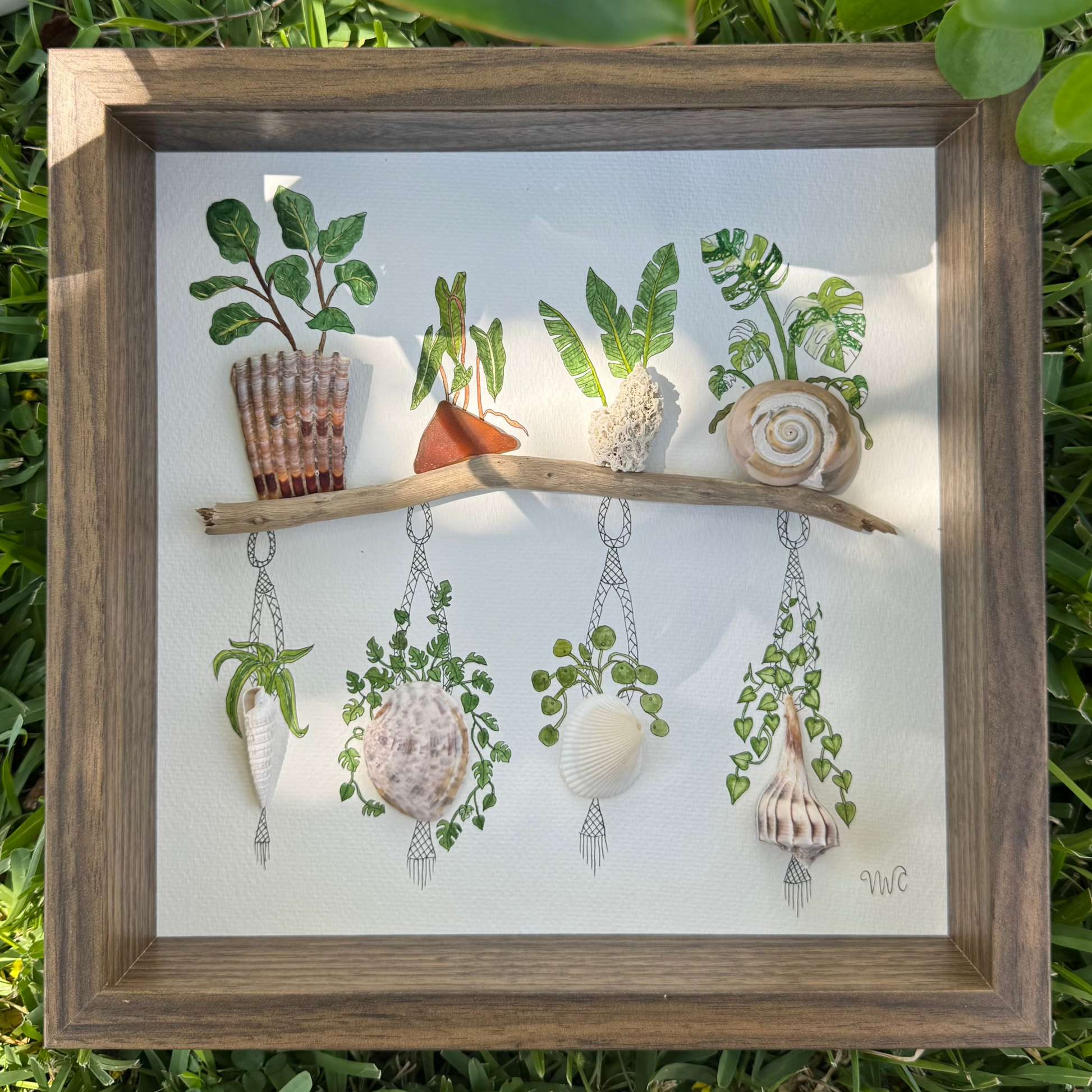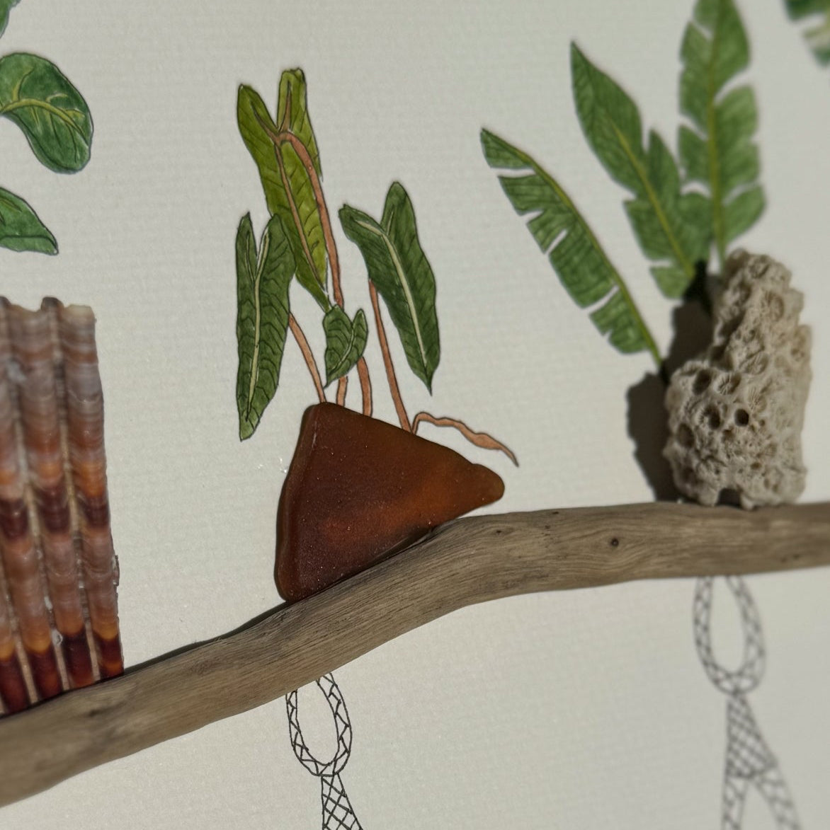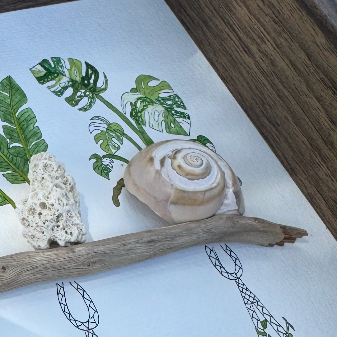 A collection of eight hand-painted botanicals paired withΒ Ark, Scallop, Cockle, and Moon shells as vases, accented by amber sea glass and natural brain coral. Each element brings earthy depth and coastal texture, creating a one-of-a-kind piece with a warm, grounded energy.