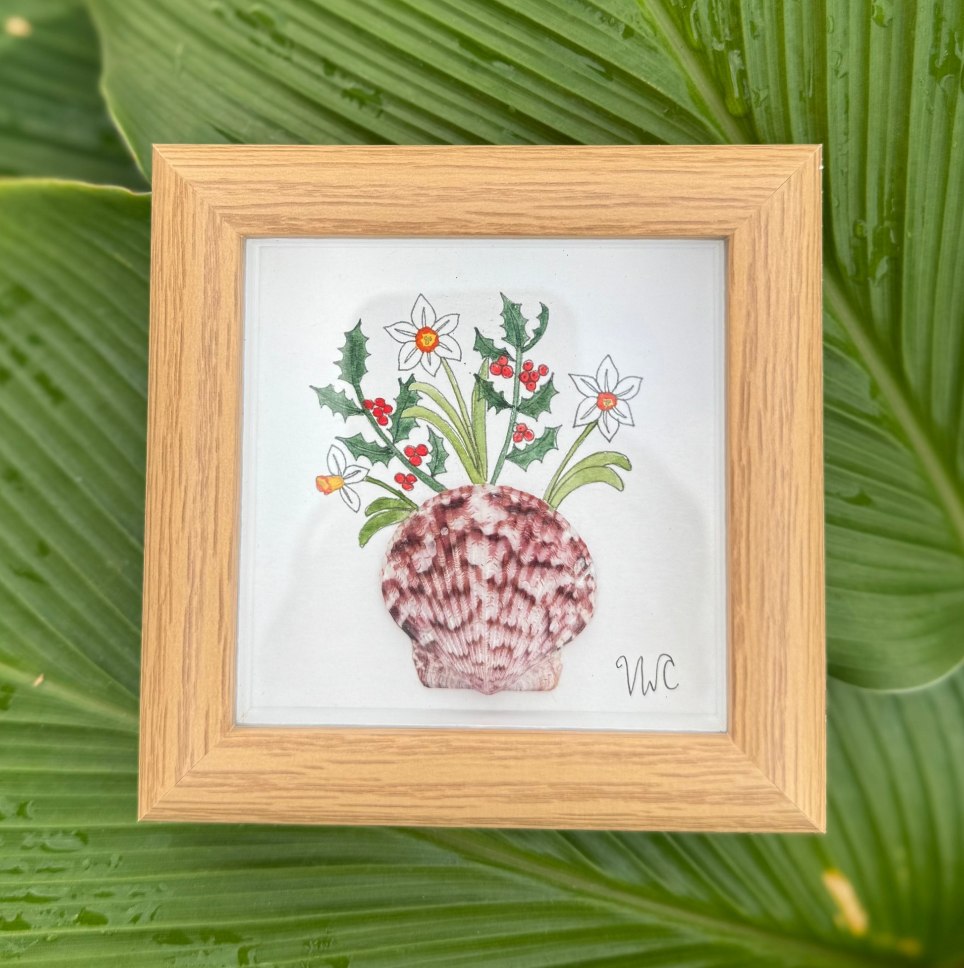 Each flower is hand-painted and paired with a real calico scallop shell collected along the coasts of Florida. No two pieces are alike and may vary slightly from the photo. The artwork is displayed in a 4 1/4 inch light wood frame, ready to gift or display.