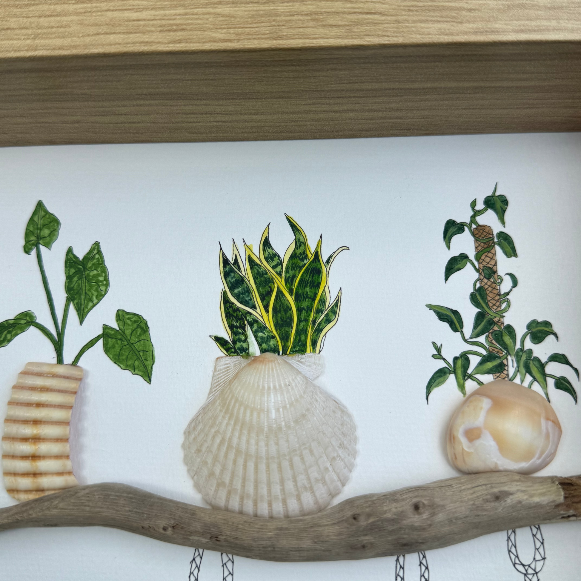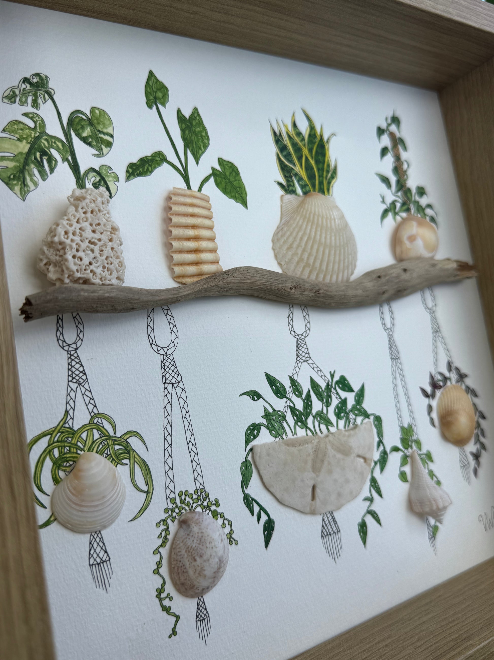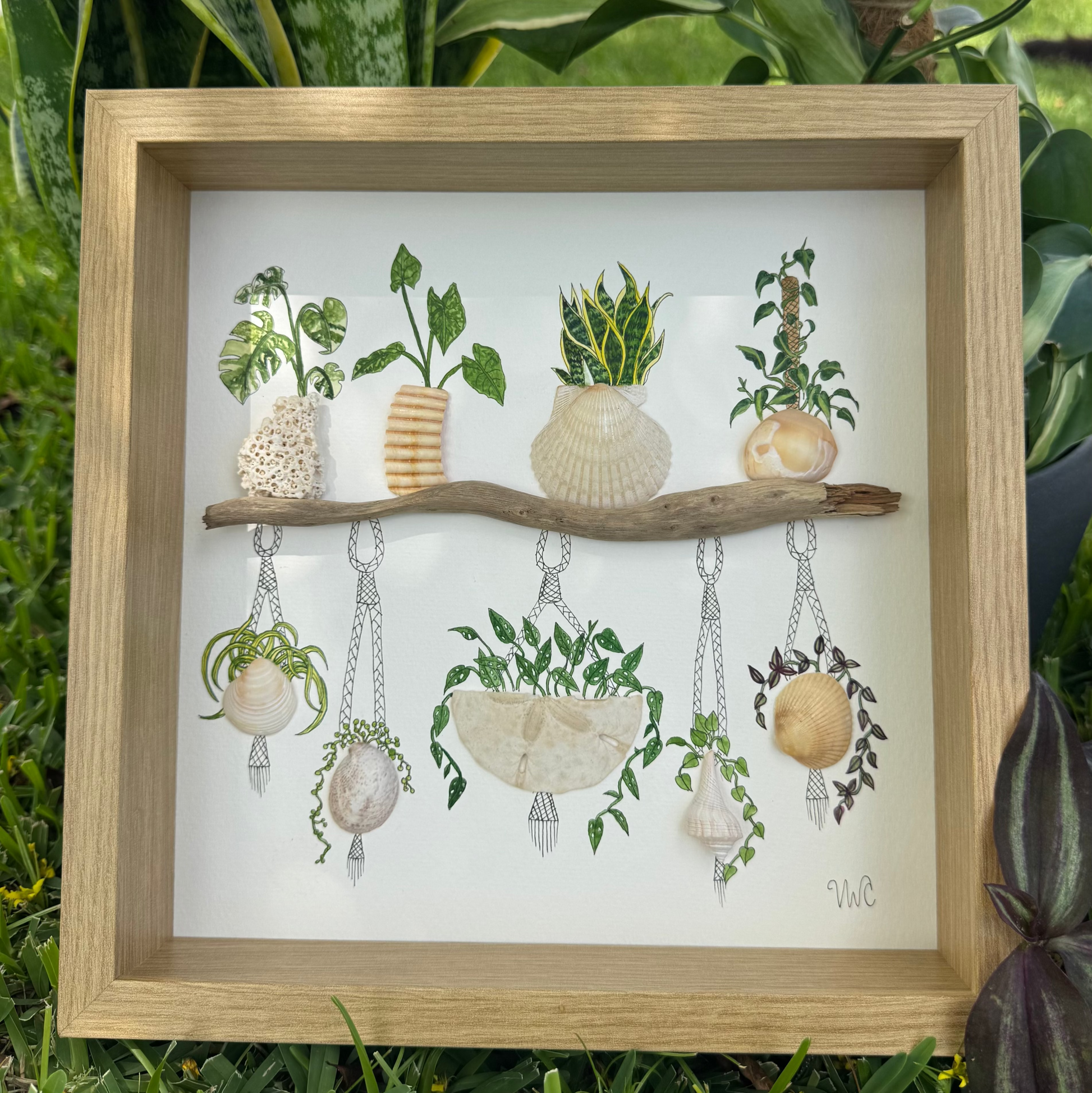 Hand-painted botanicals drawn in ink and watercolor, paired with seashell vases in soft tones of ivory, sand, and pale gold. Driftwood anchors the design, while natural elements—honeycomb coral, a spiral moon shell (shark eye), scallop and cockle shells, and a half sand dollar—add layered texture and coastal warmth. Part of the Shelf Life Collection, Ivory Tides carries the coast from the shore to your home with a light, serene palette.