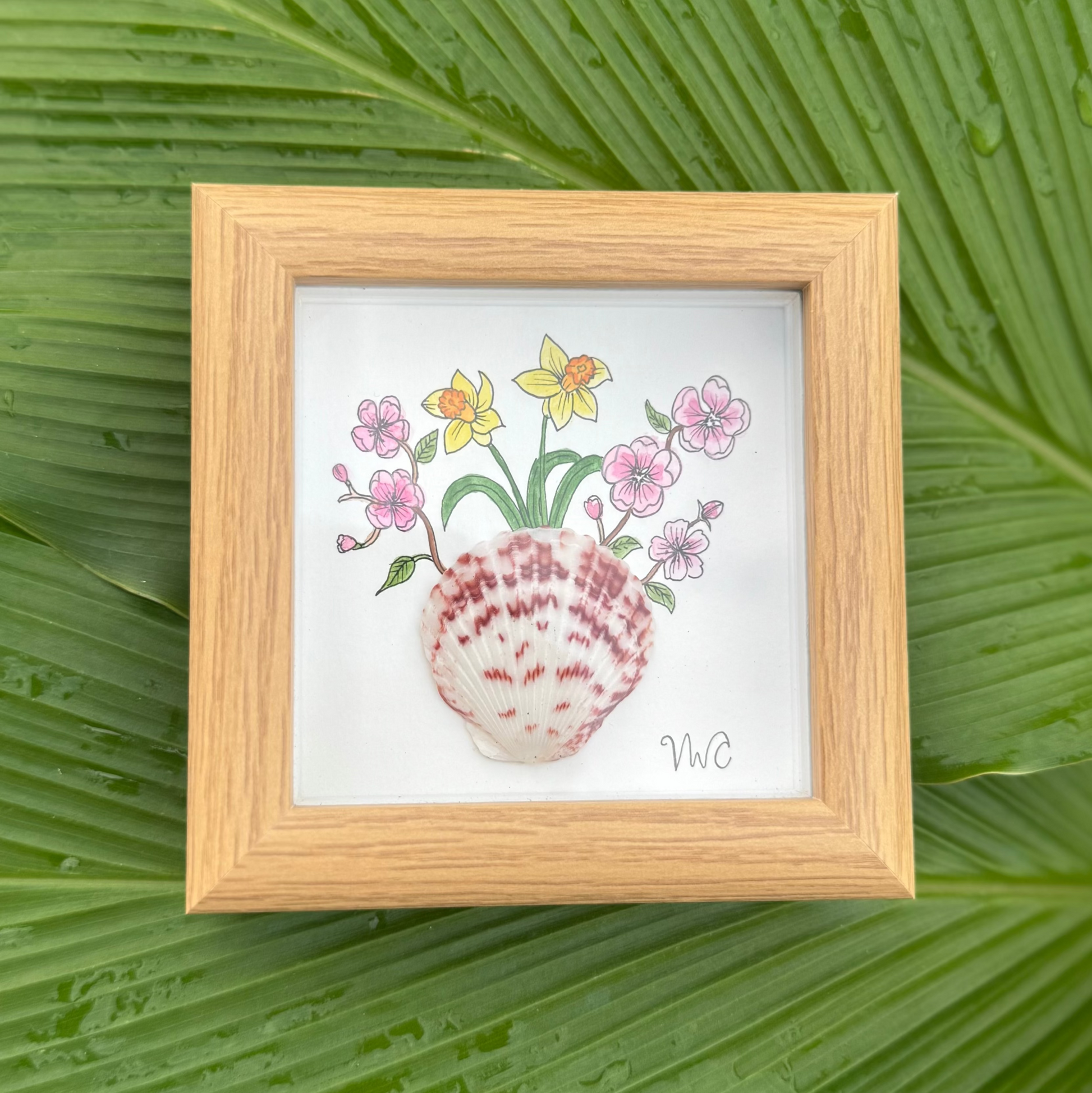 Each flower is hand-painted and paired with a real calico scallop shell collected along the coasts of Florida. No two pieces are alike and may vary slightly from the photo. The artwork is displayed in a 4 1/4 inch light wood frame, ready to gift or display.