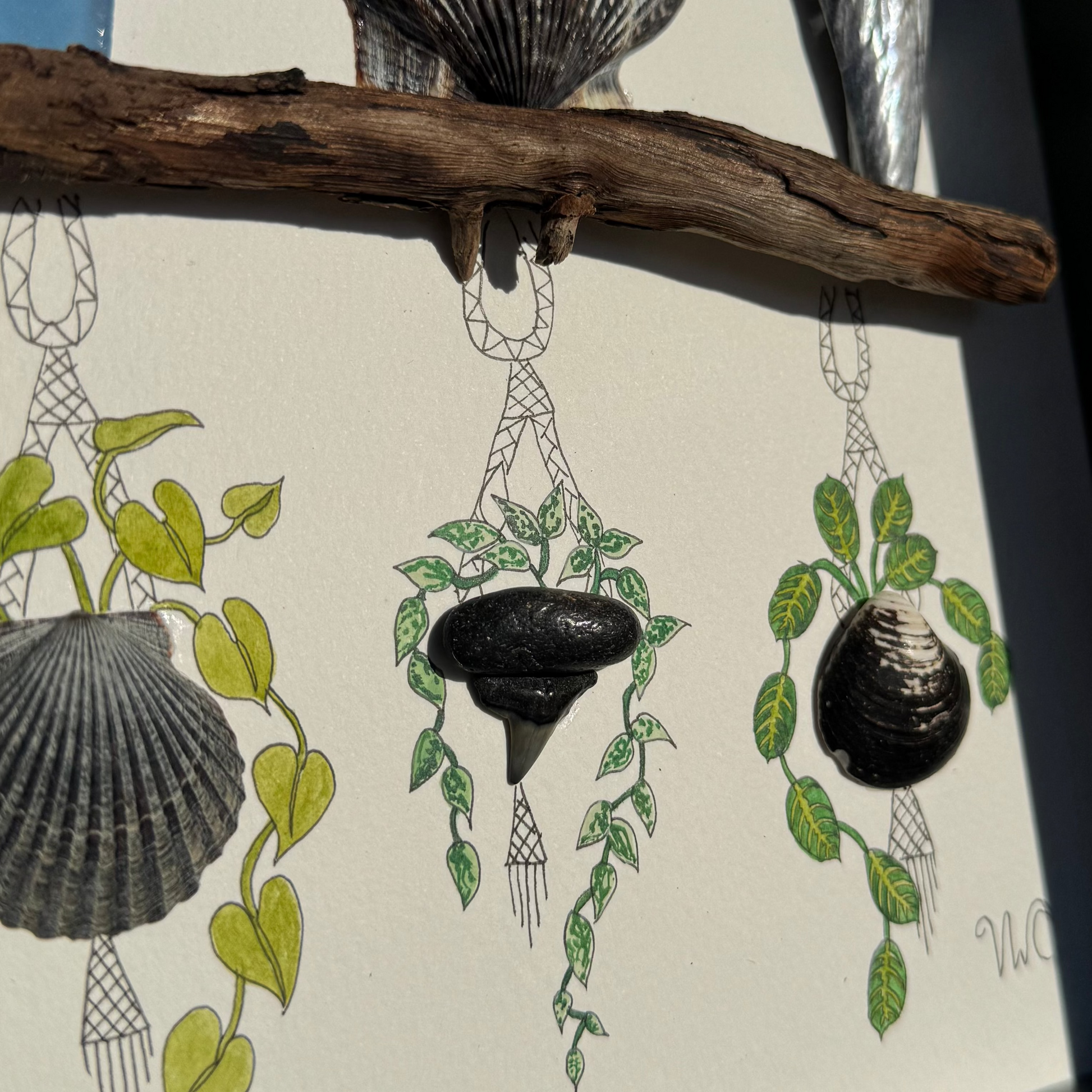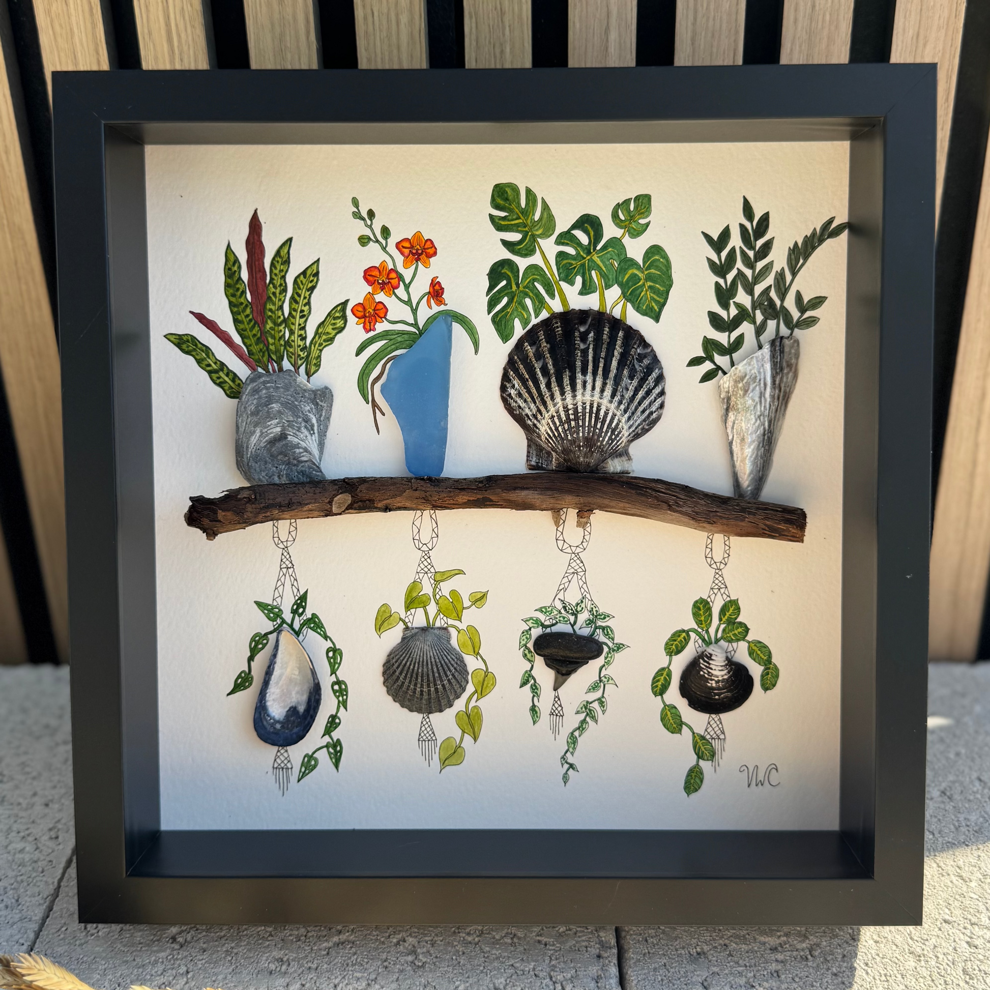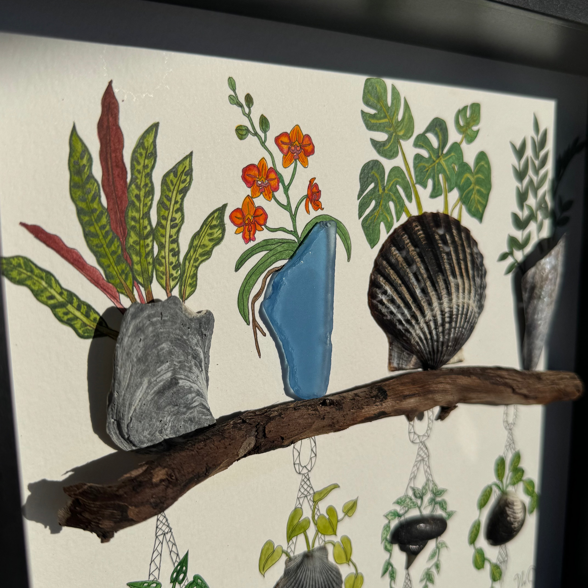 A moody botanical coastal piece featuring eight rare plants set in eight unique shells from Florida and New Jersey. Deep, earthy tones flow through dark scallops, oyster textures, sea glass, a tiny fossil, and even a shark tooth β all gathered on a real driftwood shelf. In the center of the composition, a bright pop of Cattaleya-orange blooms breaks through the darkness, adding the perfect contrast to the lush greens and trailing vines. The whole piece feels curated, coastal, and quietly enchanted.