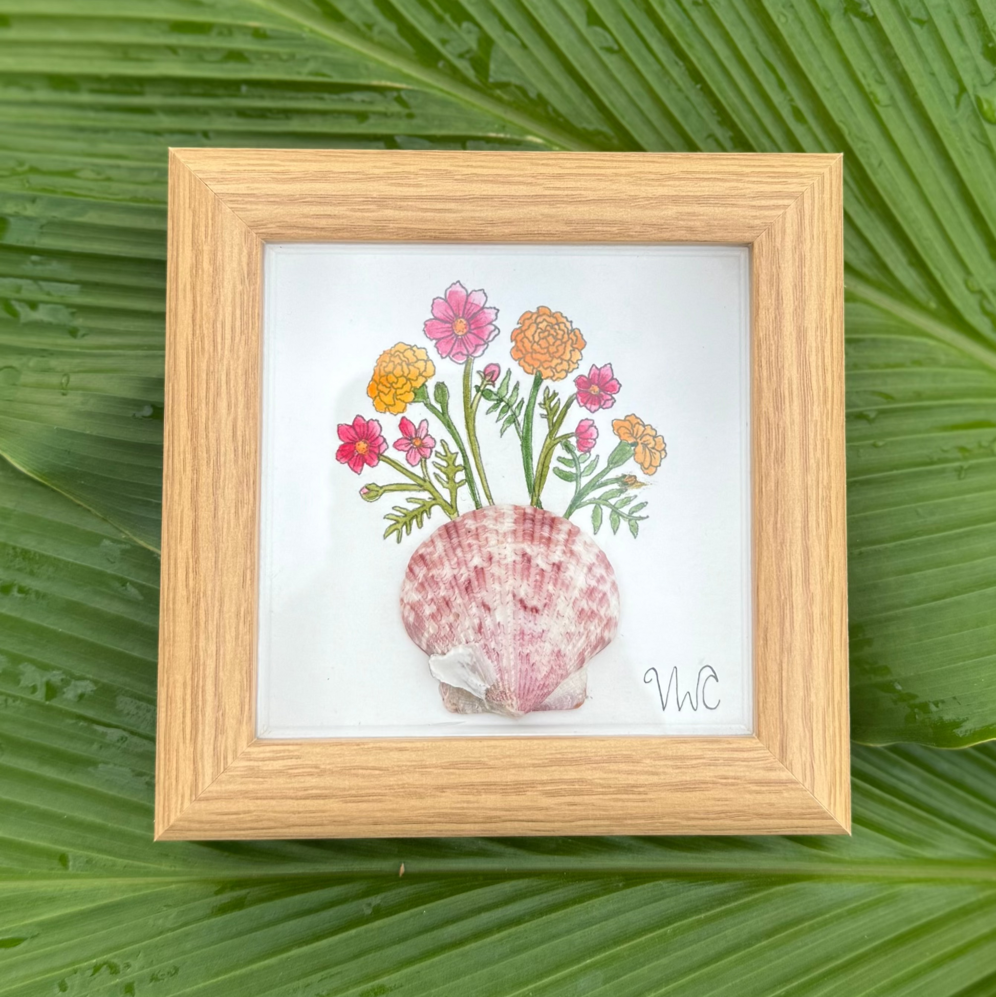 Each flower is hand-painted and paired with a real calico scallop shell collected along the coasts of Florida. No two pieces are alike and may vary slightly from the photo. The artwork is displayed in a 4 1/4 inch light wood frame, ready to gift or display